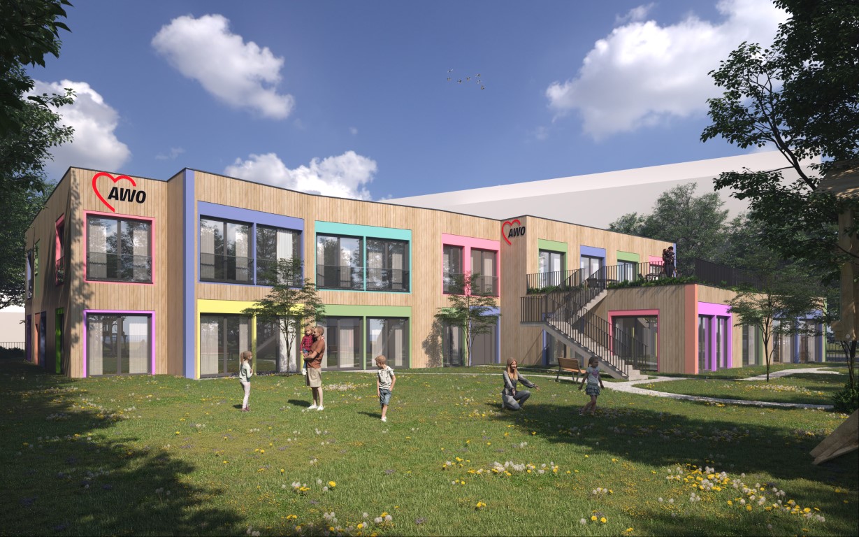 Bei dem geplanten Bauvorhaben handelt es sich um einen Neubau für einen Kindergarten, Büroflächen und Wohnapartments in Obertshausen. Die neue Ganztageseinrichtung bietet Platz für 4 Gruppen und einer Waldgruppe. Das dafür vorgesehene Teilgrundstück umfasst eine Grundfläche von ca. 2.706 m² Bei dem Baugrundstück handelt es sich um ein innerörtliches Grundstück mit altem Bestandsgebäude- und Baumbestand. Aufgrund der heutigen Anforderungen an Funktion und Gebäude ist ein Neubau an dieser Stelle erforderlich.