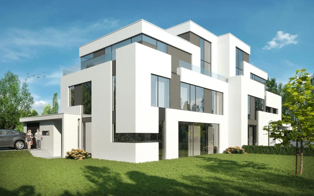 Das 2-geschossige Doppelhauses gewinnt durch eine sehr futuristische Aussenfassade und erweckt einen sehr modernen Eindruck mit vielen vertikalen wie auch horizontalen Fenstern. Die Wohnungen überzeugen durch ihre gelungene Verbindung von Licht, Exklusivität und optimaler Nutzungsmöglichkeit. Die Wirkung der bodentiefen Fenster mit der feinen Unterteilung wird durch die transparenten Balkonbrüstungen unterstrichen. Farben, Formen und Materialien sind aufeinander abgestimmt.