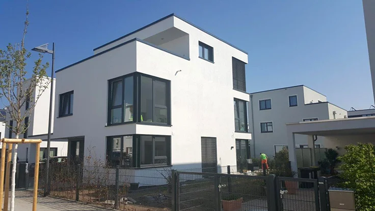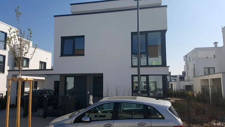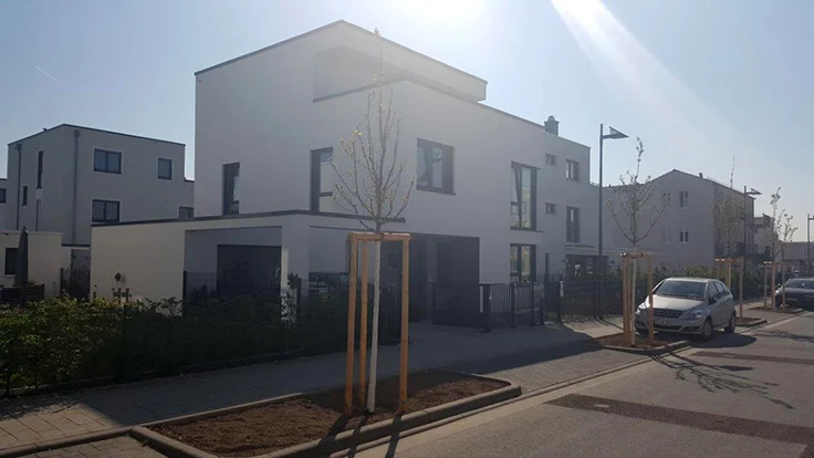 Dieses Einfamilienhauses gewinnt durch die klare Gliederung der Fassade und erweckt einen sehr futuristischen Eindruck. Die Wohnungen überzeugen durch ihre gelungene Verbindung von Licht, Exklusivität und optimaler Nutzungsmöglichkeit. Die Wirkung der bodentiefen Fenster mit der feinen Unterteilung der horizontalen und vertikalen Elemente sucht Ihresgleichen. Farben, Formen und Materialien sind aufeinander abgestimmt. Eine besondere Atmosphäre entsteht in den Dachgeschoss-Wohnungen durch Penthouse-Feeling. Die Fahr- und Gehwege wurden gepflastert. Die verbleibende Grundstücksfläche wurde mit Rasen eingesät und Solitärbäume und Sträucher wurden gepflanzt.