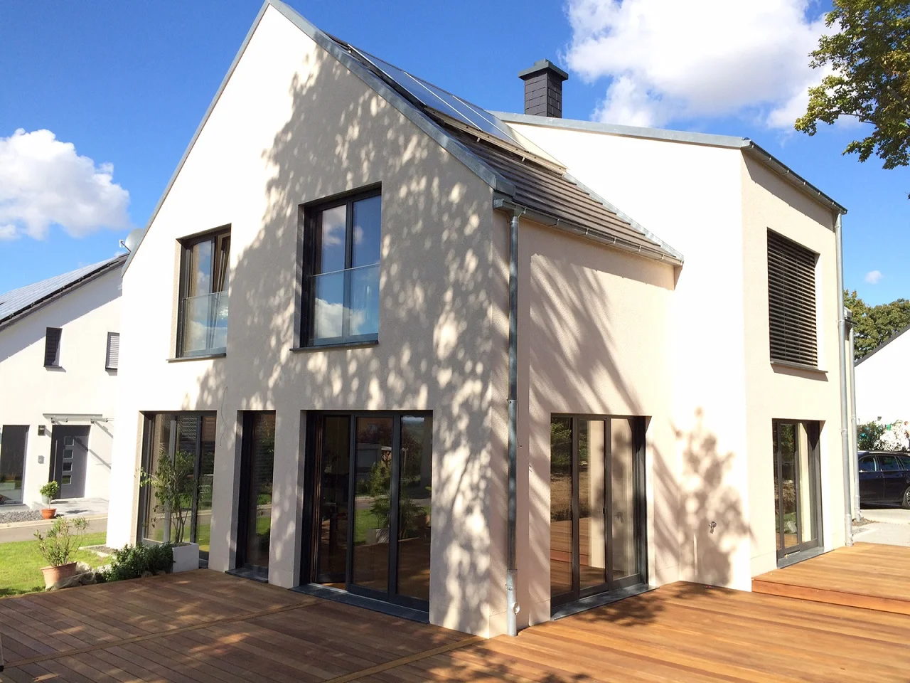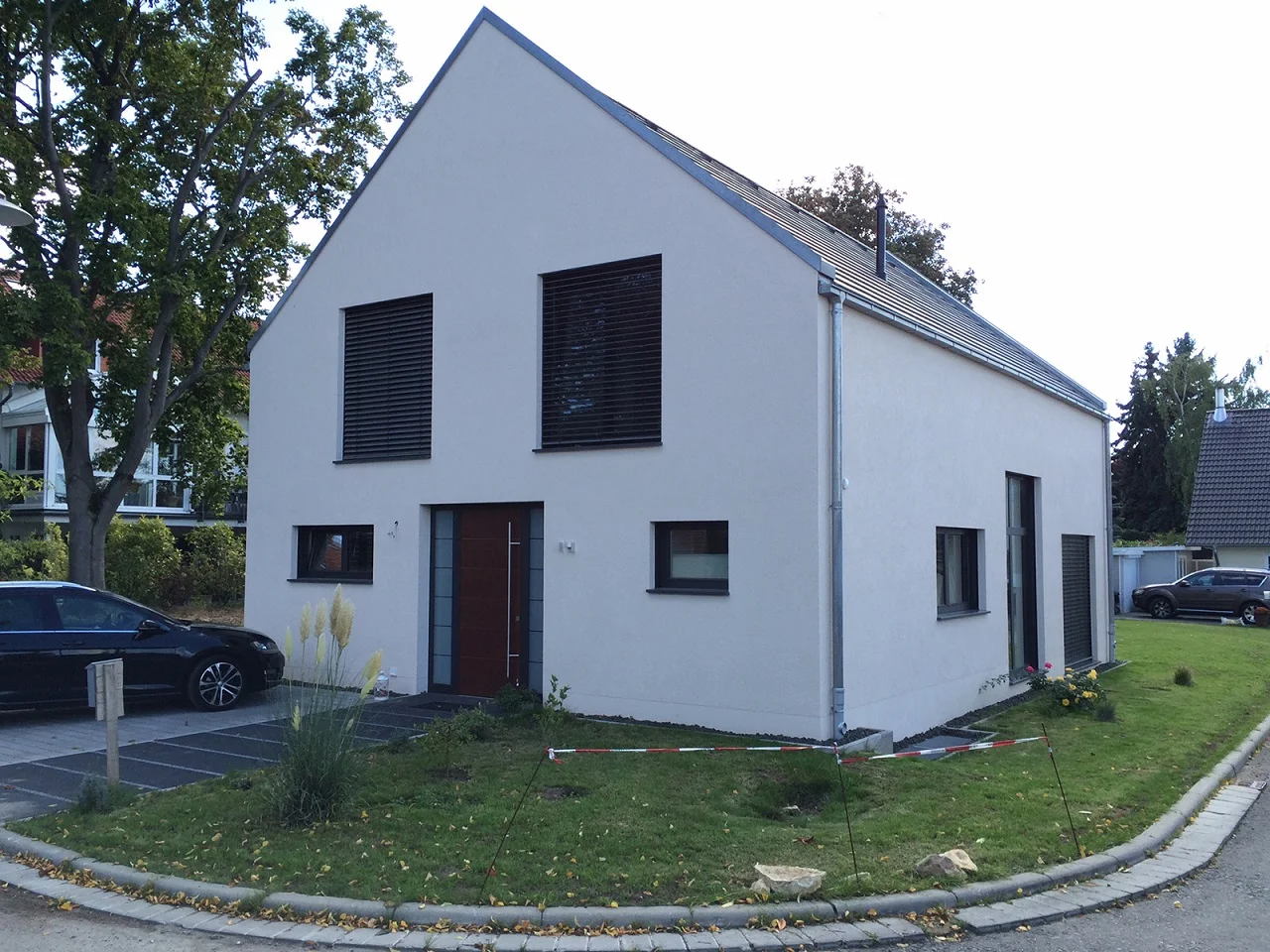 Das 2-geschossige Einfamilienhauses gewinnt durch die schöne Gliederung der Fassade und erweckt einen sehr schönen, sauberen und klassischen Eindruck. Die Wohnungen überzeugen durch ihre gelungene Verbindung von Licht, Exklusivität und optimaler Nutzungsmöglichkeit. Die Wirkung der bodentiefen Fenster mit der feinen Unterteilung wird durch die transparenten Balkonbrüstungen unterstrichen. Farben, Formen und Materialien sind aufeinander abgestimmt.
