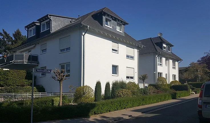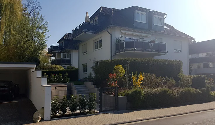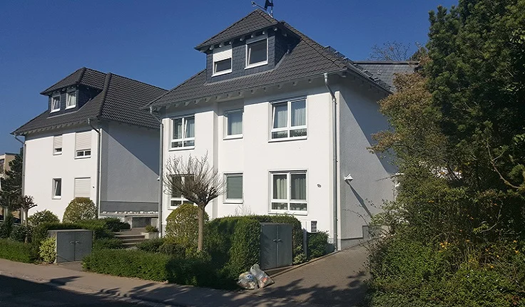 Das 3-geschossige Mehrfamilienhaus gewinnt durch die klare Gliederung der Aussenfassade und erweckt einen sehr modernen Eindruck. Die Wohnungen überzeugen durch ihre gelungene Verbindung von Licht, Exklusivität und optimaler Nutzungsmöglichkeit. Farben, Formen und Materialien sind aufeinander abgestimmt. Die Fahr- und Gehwege werden gepflastert. Die verbleibende Grundstücksfläche wurden mit Rasen eingesät und Solitärbäume und Sträucher wurden gepflanzt.