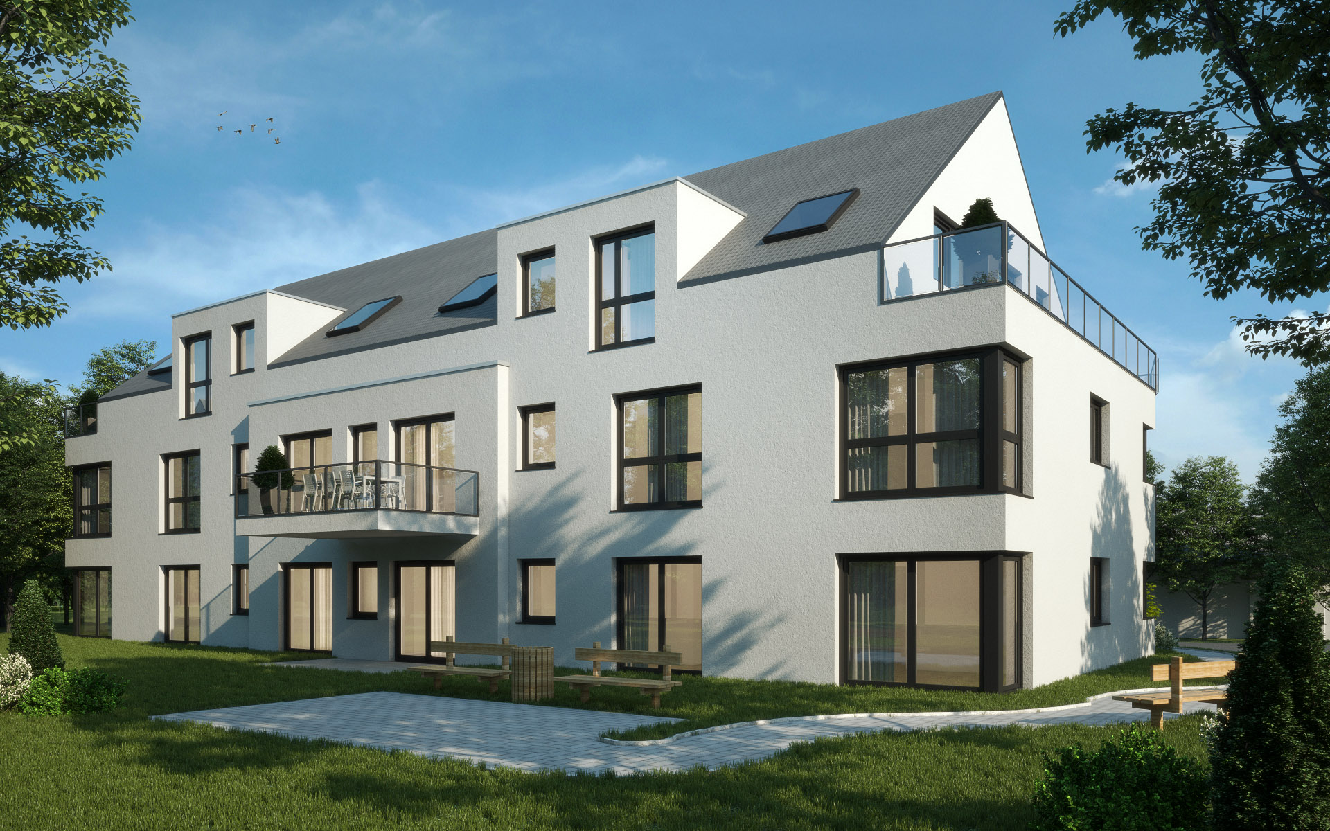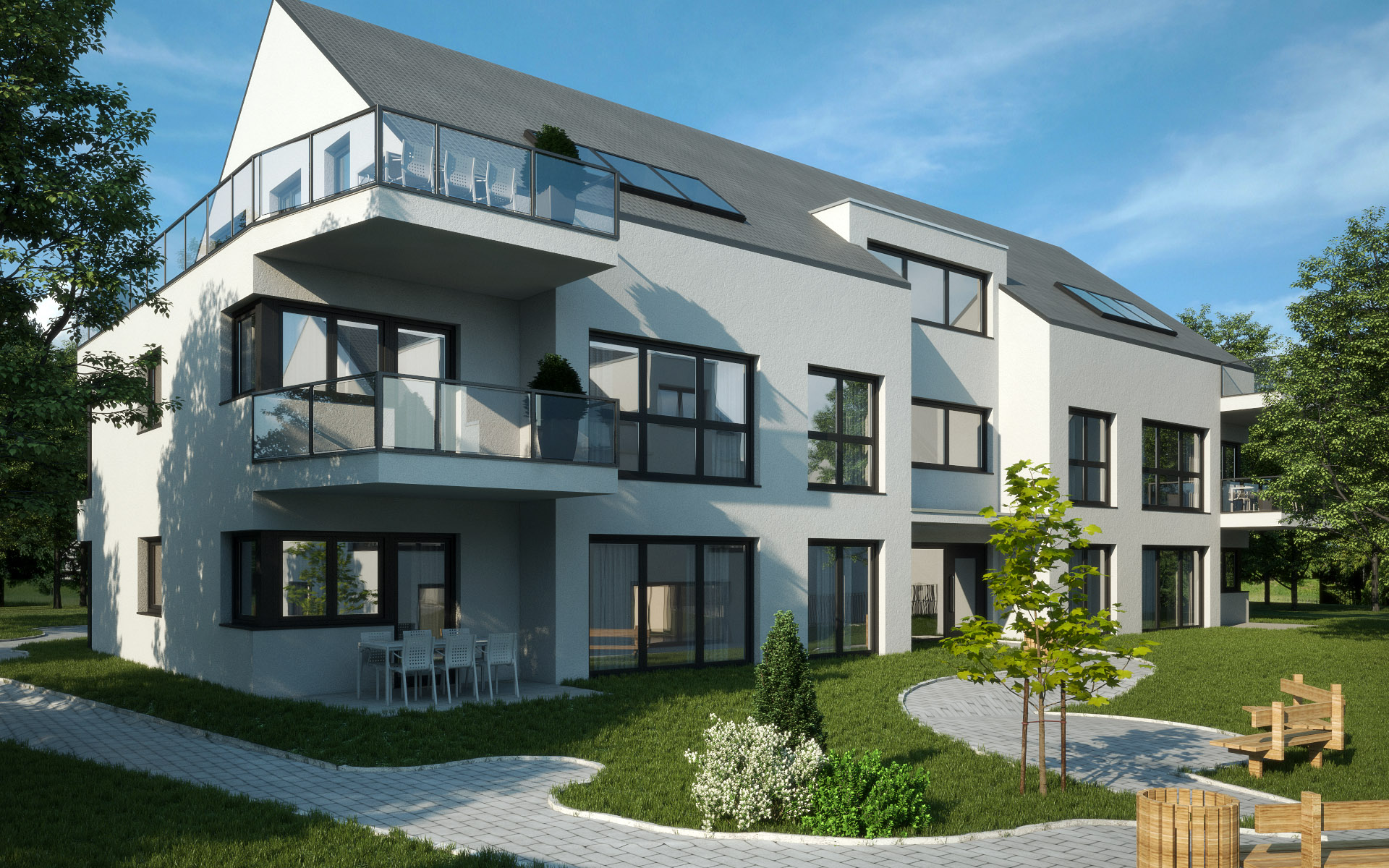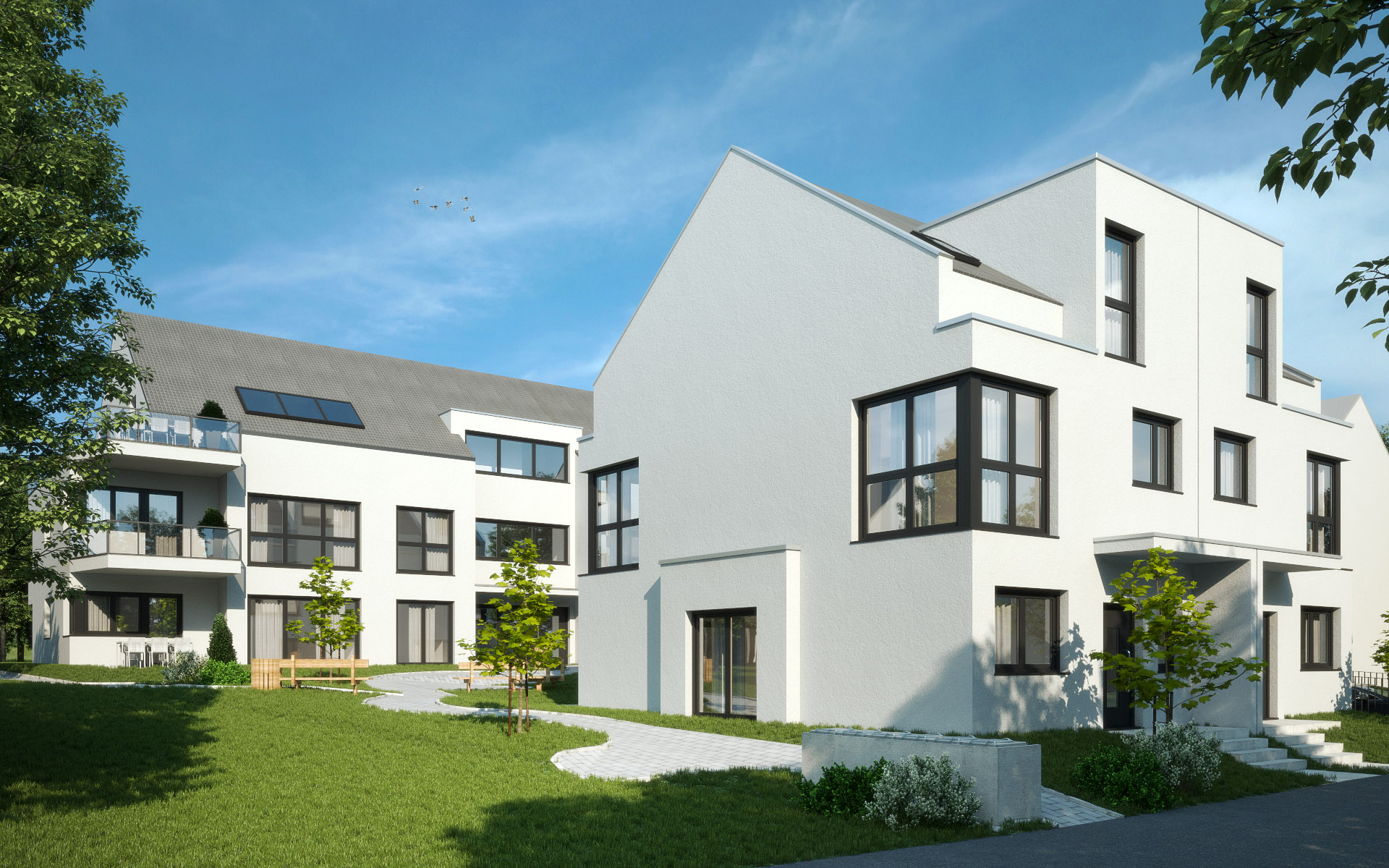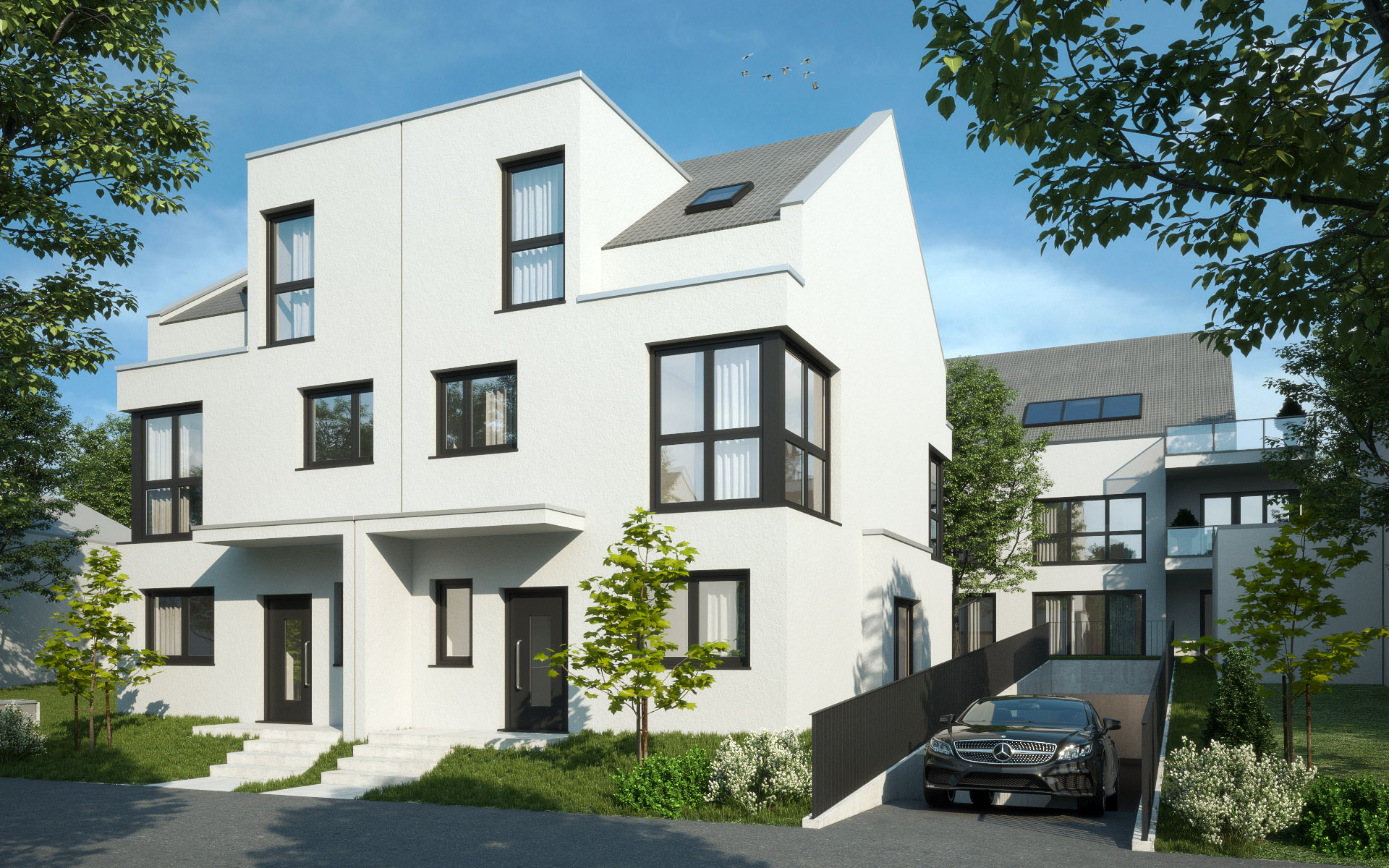Neubau von einem Doppelhaus und einem Mehrfamilienhaus auf einer gemeinsamen Tiefgarage in