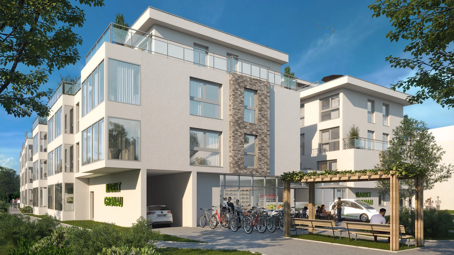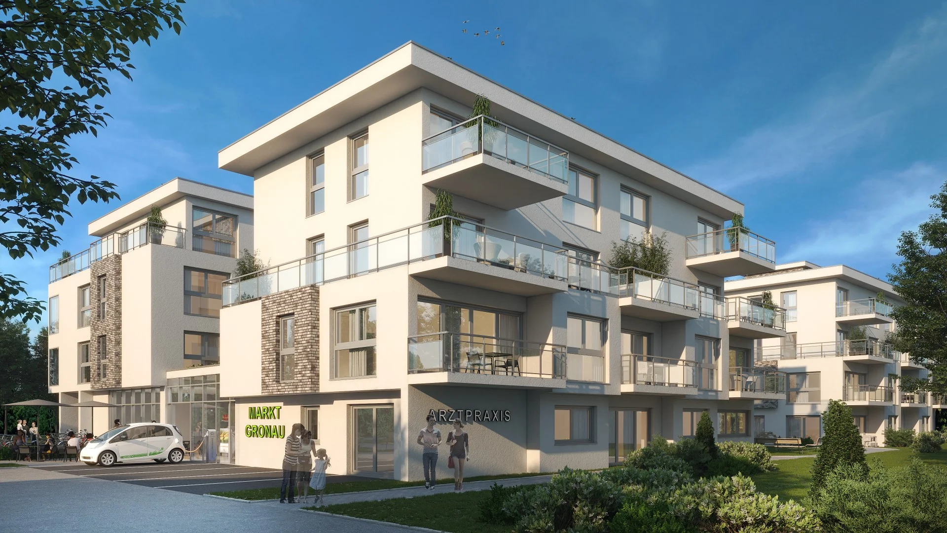 Neubau von 4 Mehrfamilienhäusern einem Kleinmarkt, Cafe/Bäckerei, Postfiliale und einer Arztpraxis auf einer gemeinsamen Tiefgarage in Bad Vilbel / Gronau