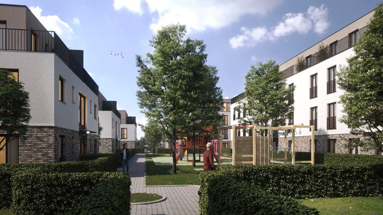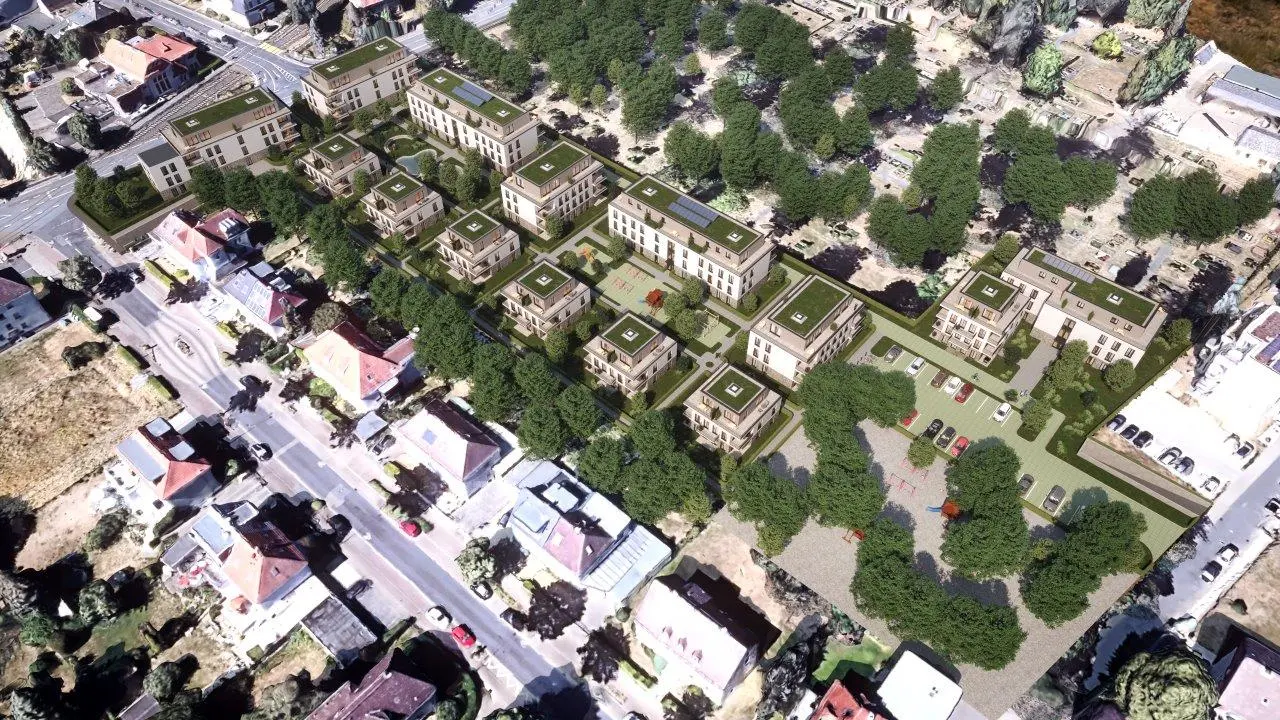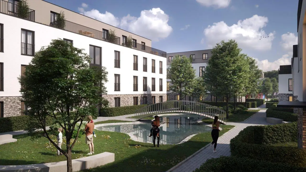 Prägendes architektonisches Gestaltungselement wird die Gliederung der Fassaden durch Vor- und Rücksprünge, welche zusätzlich durch zurückspringenden Loggien verstärkt wird. Die zwei bis dreigeschossigen Gebäude zzgl. Staffelgeschoß sind größtenteils als Wohngebäude konzipiert, beginnend von kleinen 1,5-Zimmer-Wohnungen bis hin zu großen 5-Zimmer-Wohnungen. Alle Wohnungen sind barrierefrei. Alle Gebäude erhalten Staffelgeschosse mit teilweise parkseitigen Dachterrassen. Im gesamten Baugebiet bilden die angrenzenden Gebäude einen Innenhof, welcher als begrünte Gemeinschaftsfläche mit integrierten Spielflächen und Feuchtbiotopen vorgesehen ist. An den Grenzen des Baugebiets orientieren sich als Ergänzung zur anliegenden öffentlichen Kinderspielplatz eine Kindertagesstätte und gegenüberliegend eine Betreute Wohnanlage. Ggf. können auch ein Arztzentrum und eine Geriatrie die Anlage vollenden. PKW-Stellplätze befinden sich komplett unterirdisch in einer Tiefgarage und werden teilweise für die Ausstattung mit Elektro-Ladesäulen vorgerüstet. Besucherstellplätze sind im oberen Feld der Gesamtanlage vorgesehen.