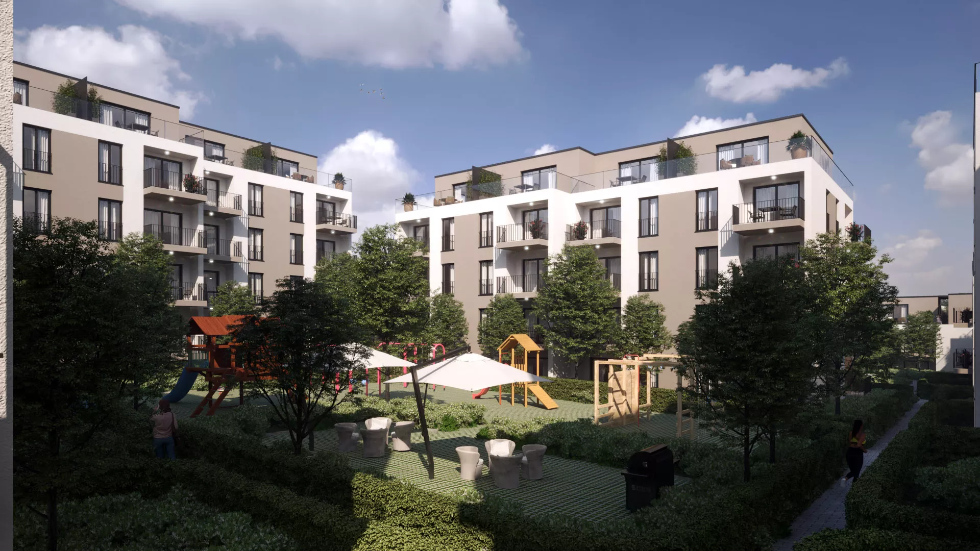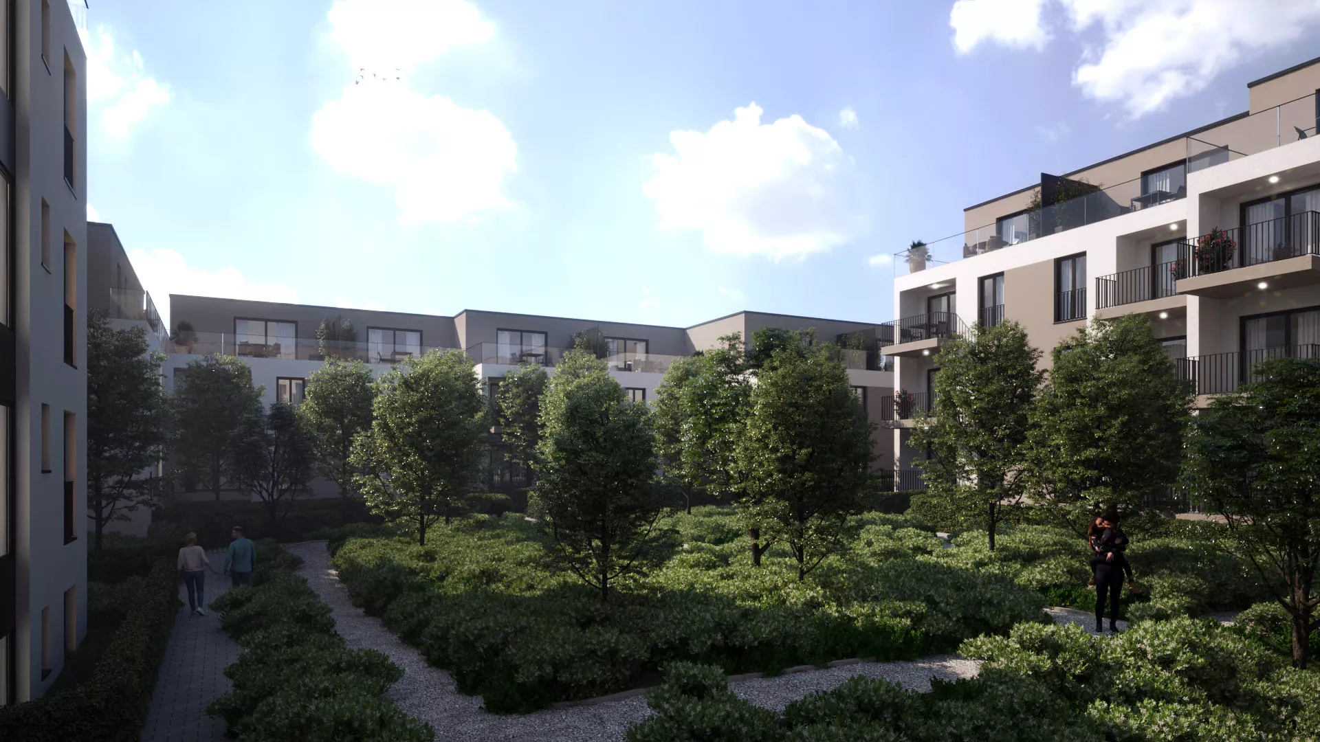 Prägendes architektonisches Gestaltungselement wird die Gliederung der Fassaden durch Vor- und Rücksprünge, welche zusätzlich durch zurückspringenden Loggien verstärkt wird. Die vorwiegend viergeschossigen Gebäude zzgl. Staffelgeschoß sind größtenteils als Wohngebäude konzipiert, beginnend von kleinen 1,5-Zimmer-Wohnungen bis hin zu großen 5-Zimmer-Wohnungen. Alle Wohnungen sind barrierefrei. Alle Gebäude erhalten Staffelgeschosse mit teilweise parkseitigen Dachterrassen. Im gesamten Baugebiet bilden die angrenzenden Gebäude einen Innenhof, welcher als begrünte Gemeinschaftsfläche mit integrierten Spielflächen und Feuchtbiotopen vorgesehen ist. An den Grenzen des Baugebiets orientieren sich als Ergänzung zur anliegenden öffentlichen Kinderspielplatz eine Kindertagesstätte und gegenüberliegend eine Betreute Wohnanlage. Ggf. können auch ein Arztzentrum und eine Geriatrie die Anlage vollenden. PKW-Stellplätze befinden sich komplett unterirdisch in einer Tiefgarage und werden teilweise für die Ausstattung mit Elektro-Ladesäulen vorgerüstet. Besucherstellplätze sind im oberen Feld der Gesamtanlage vorgesehen.